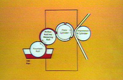 | Com dèiem, premses flexogràfiques són menys complicats que els utilitzats per altres processos d'impressió. La premsa flexogràfiques típic inclou quatre rodets mostrats aquí. Un rollturning rubberfountain en una cassola de tinta tinta reparteix un acer o ceramicink rotllo de mesuramenti després al cilindre theplate.El paper o els altres substrats per imprimir llavors passa entre el cilindre de placa i un cilindre metalimpression polit. | ![]() |